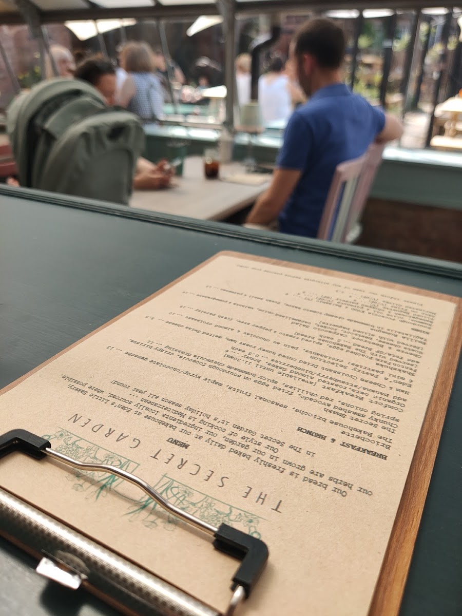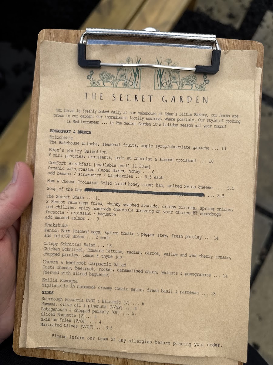 The Secret Garden offers a delightful array of dishes for breakfast and brunch, with comforting options such as the Briochette, perfect for those seeking a sweet start to the day. For a savory option, the Comfort Breakfast provides a satisfying meal. The Ham & Cheese Croissant features dried cured honey roast ham and melted Swiss cheese, a classic combination that never disappoints. Another highlight is the Soup of the Day, served with a slice of bread and topped with melted Gruyere cheese, offering a warm and hearty option. For sides, there are several tempting choices, including Sourdough Focaccia with Evoo & Balsamic, a great accompaniment to any meal. The Hummus, Olive Oil & Pinenuts provides a refreshing and light option, while the Babaganoush with Chopped Parsley offers a flavorful Mediterranean touch. Additionally, for those craving something more substantial, the Sliced Baguette and Skin On Fries are always popular choices. The menu is simple yet thoughtfully curated, with prices offering great value for the quality of ingredients and care put into each dish.